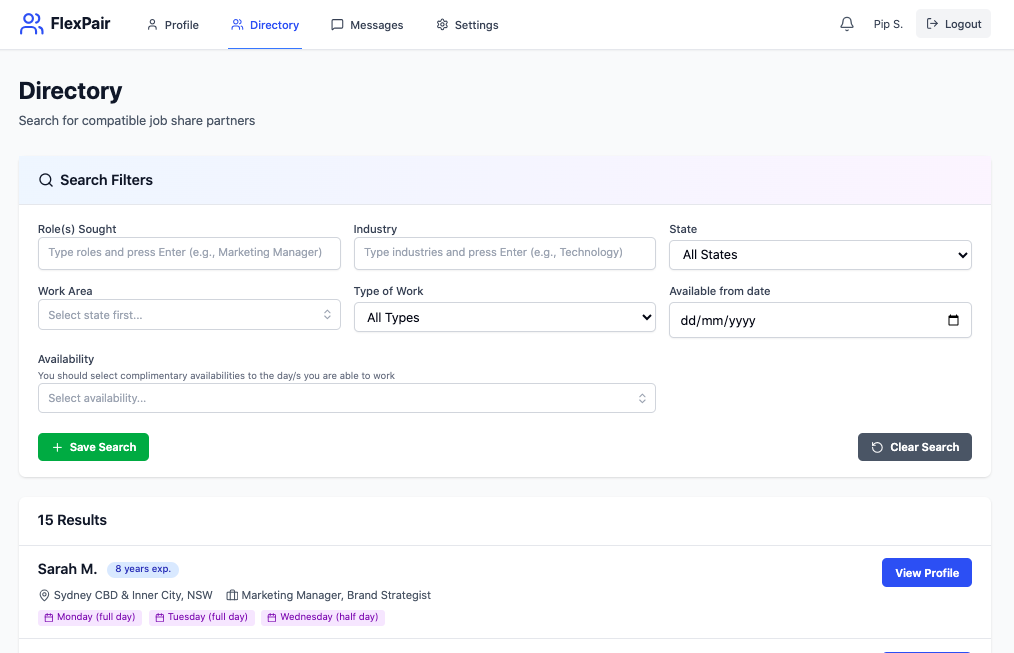 FlexPair provides a platform which allows two compatible professionals, that wish to work in a part-time capacity, to connect, with the goal of securing a full-time role together.